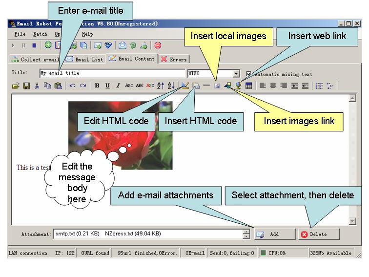 The default setting can also send email.Import-mail, write mail, then click send button.When sending a large number, you can set several parameters to send. See